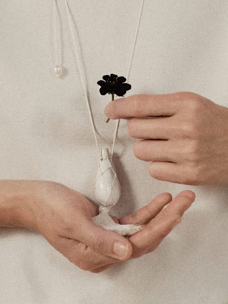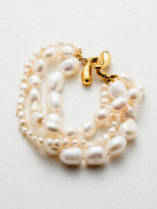 A pearl necklace that can be separated into two bracelets, joined by our signature Tadpole clasp.