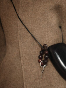 Mahogany beads held together by a hidden magnet.