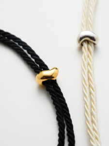 A soft satin cord with tassels — the metal bean makes it distinctive.